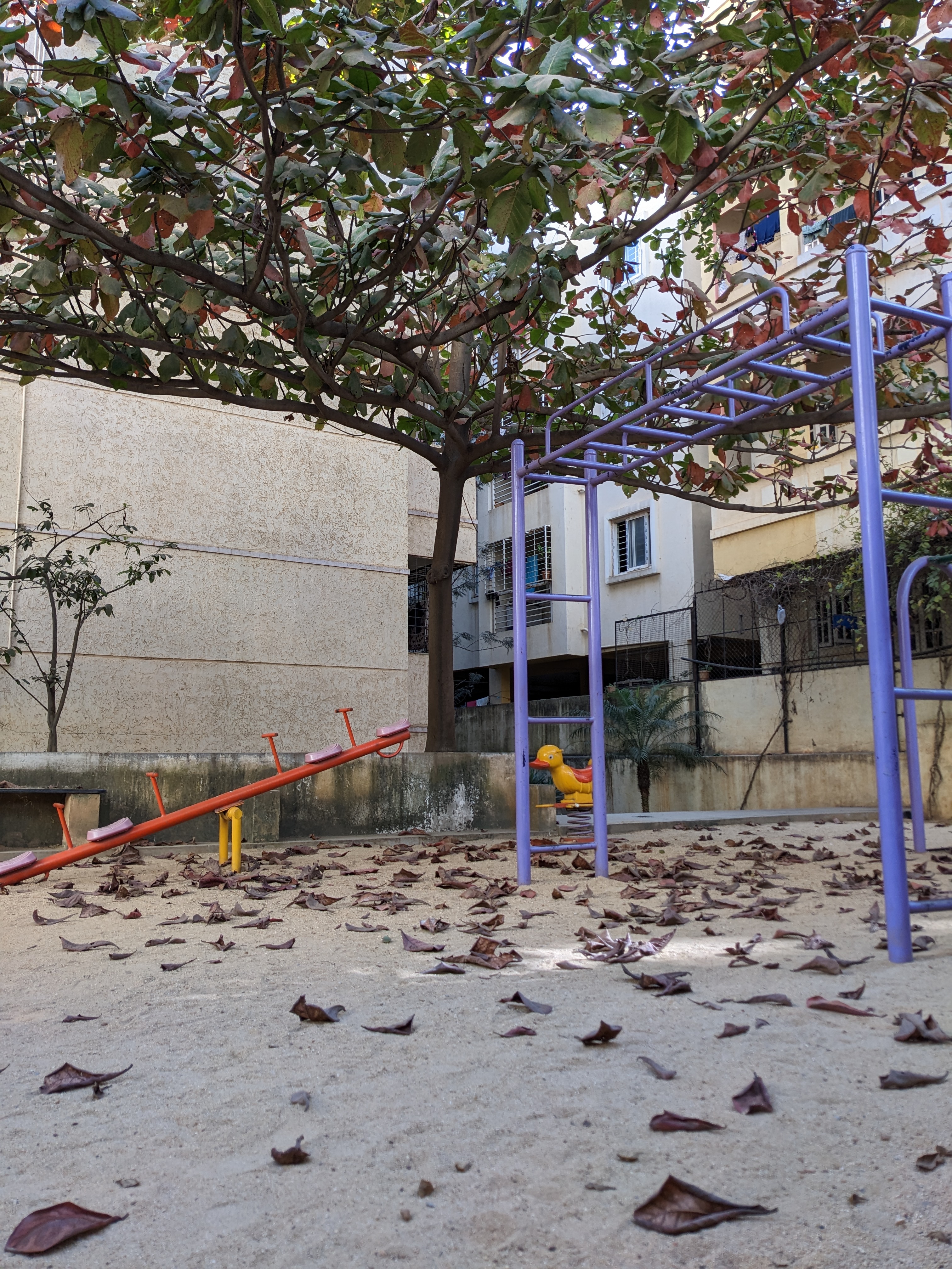 I clicked this pic when I had gone to the play area inside our apartment complex. When I was trying to think of a caption, the first thing that came to mind was “Fall (the season)” But it is not fall season now, spring is right around the corner.